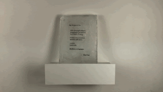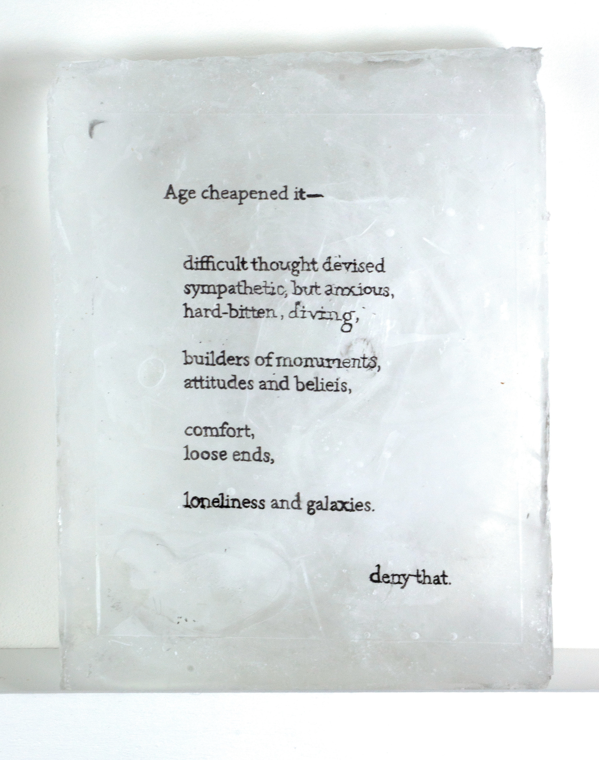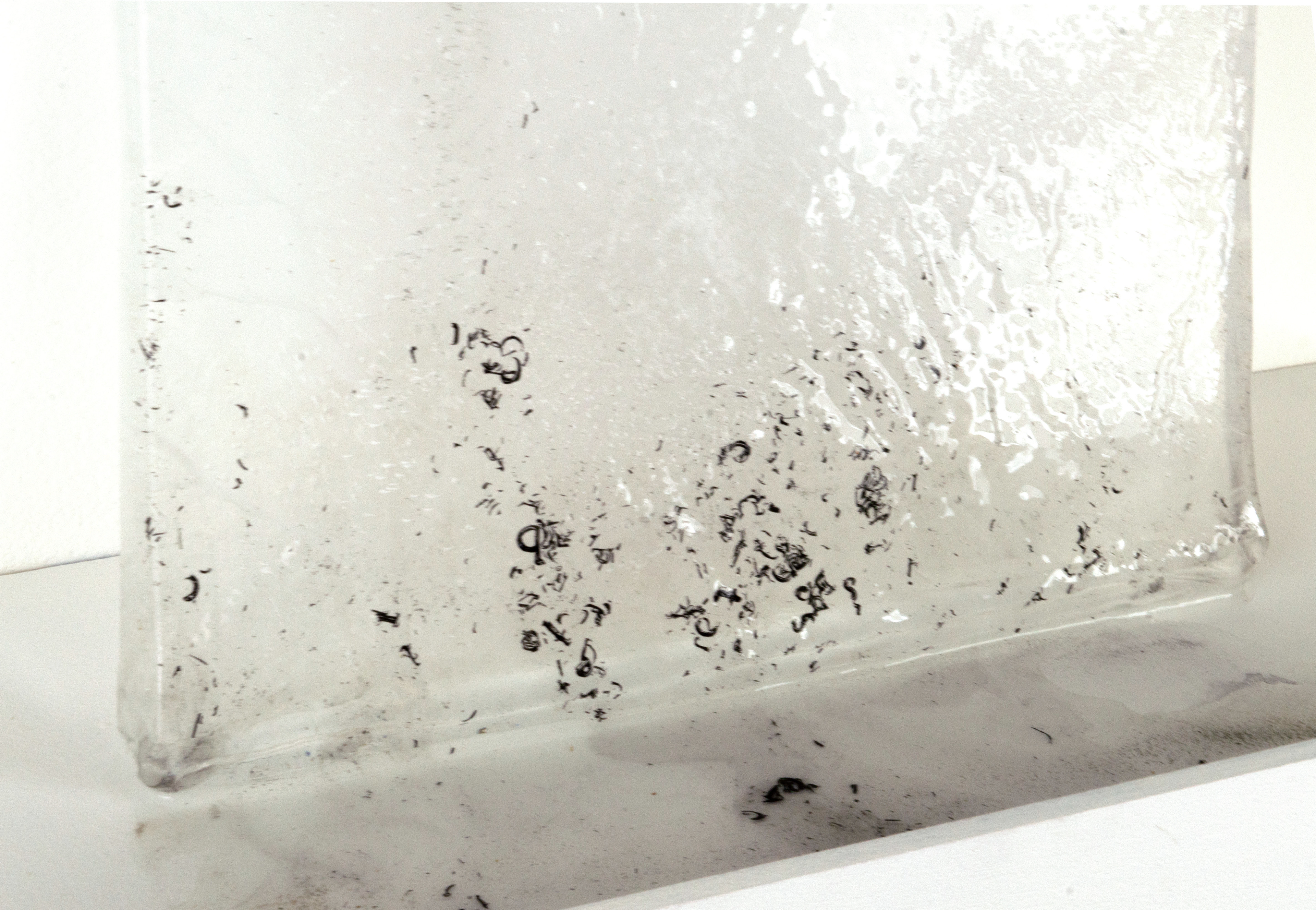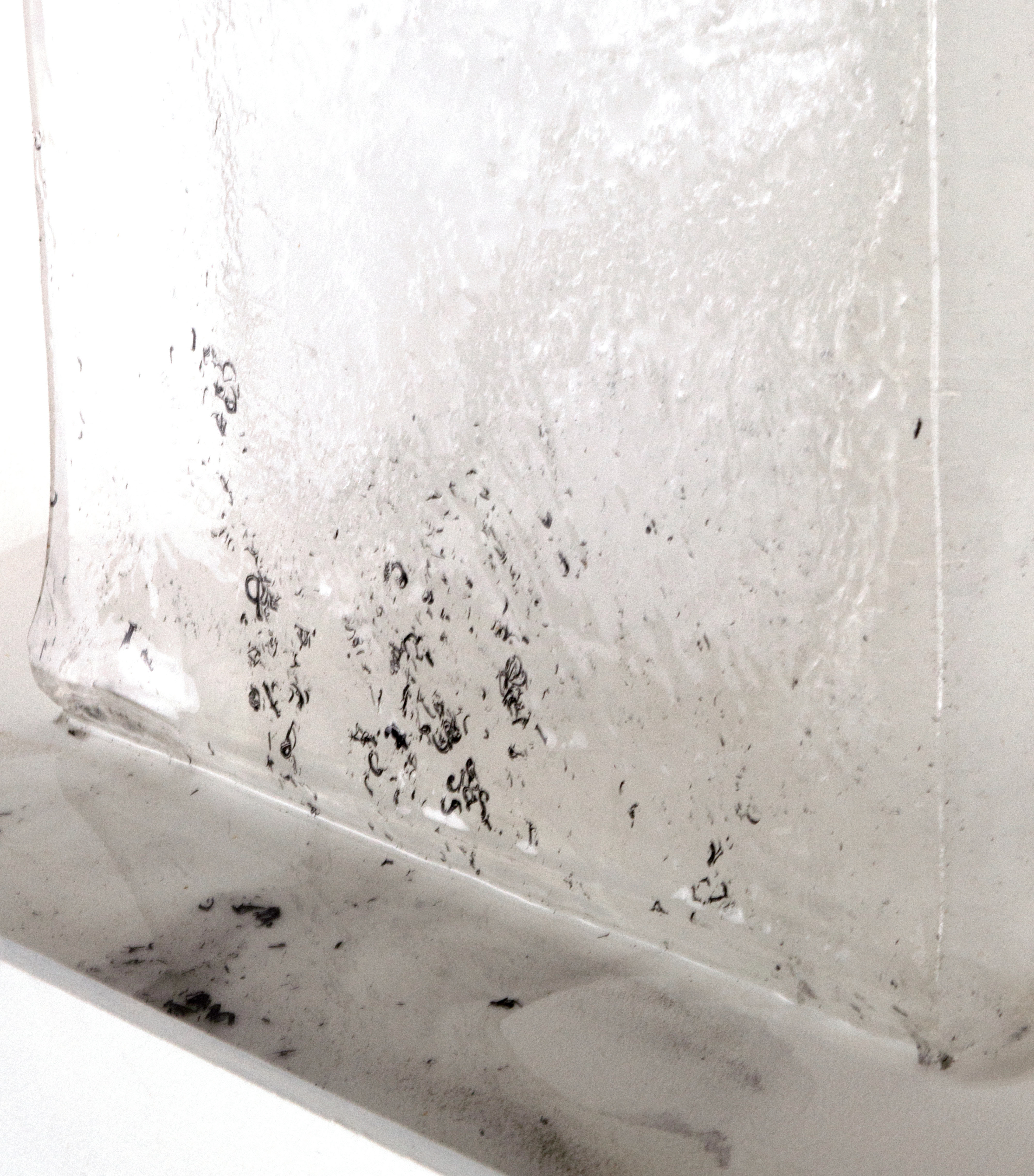 acrylic paint, coffee, artist saliva, and ink mixture; monotype on ice block. ephemeral sculpture